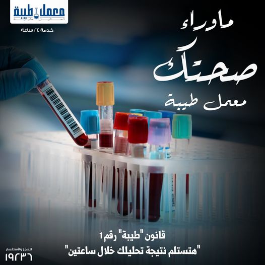 معمل طيبة للتحاليل الطبية خدمة 24 ساعة الفرع الرئيسي : 98 شارع التحرير - ميدان الدقي - برج الدقي الأداري ت: 37600411 ويعمل 24 ساعة وسط البلد : 11 ميدان الفلكي - باب اللوق ت: 23911437 مصر الجديدة : 12 شارع بطرس غالي - روكسي ت: 24557050 مدينة نصر: 52 شارع مصطفى النحاس تقاطع مكرم عبيد من 9 صباحاً حتى 12 مساءاً الجيزة (1): 1 شارع مراد ميدان الجيزة من 9 صباحاً حتى 12 مساءاً الجيزة (2): 511 شارع الاهرام عمارة النصر ميدان الجيزة من 9 صباحاً حتى 12 مساءاً 6 اكتوبر: 39 شارع المحور المركزي امام جامعة اكتوبر (الحصري) من 9 صباحاً حتى 12 مساءاً معمل طيبة هو الرائد في مجال التحاليل الطبية بمصر وذلك من خلال الخدمات المتميزة التي نقدمها لعملائنا تحت إشراف نخبة متخصصة من أساتذة التحاليل الطبية وبإستخدام أحدث أجهزة التحاليل الممكنة وأجود المحاليل المعتمدة دوليا بإضافة إلى ماسبق نحن أول من أخضع الدورة التحليلية بالكامل لمراقبة نظم المعلومات المتطورة لضمان مصداقية نتائج التحاليل. معمل طيبة أول من أدخل في مصر برنامج الحاسب الألى للتأكد من دقة وصحة ومصداقية نتائج كل مريض . نستخدم الباركود للتعرف على العينات وربط أجهزة التحاليل والطباعة ببرنامج المعمل المركزى لمنع إحتمال الخطأ البشرى في إدخال العينات على الأجهزة أو كتابة النتائج . يشرف على التحاليل نخبة من أفضل أساتذة الطب المعملى بالجامعات المصرية ولهم خبرات كثيرة. جميع الأجهزة والمحاليل معتمدة دوليا من منظمة الأغذية والأدوية العالمية. توافر جميع الإختبارات التقليدية والغير تقليدية من خلال قائمة ممتدة من التحاليل تصل إلى ( 2000 ) إختبار . حصول المعمل علي شهادة الجودة العالمية .