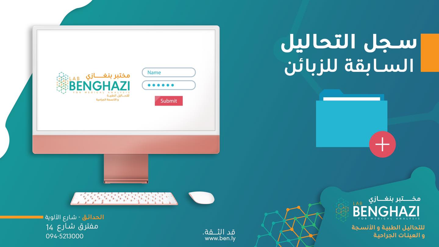 مختبر بنغازي للتحاليل الطبية و العيادات التخصصية. في خدمتكم طيلة ايام الاسبوع مختبر بنغازي للتحاليل الطبية و العيادات التخصصية والعينات الجراحية يمتاز مختبرنا بالدقة في النتائج وسرعة الاداء تحت اشراف افضل الفنين في مجال المختبرات مع حسن المعاملة و الاستقبال كما يعمل مختبر بنغازي ع ارسال التحاليل الغير متاحة في ليبيا الي الخارج ويستقبل المختبر العينات الجراحية تأسس مختبر بنغازي للتحاليل الطبية والعينات الجراحية سنة 2015 ورغم ذلك فإن له قاعدة علمية تخصصية تتمثل في الاستفادة من الخبرات السابقة في هذا المجال وكذلك المنهج الذي وُضع لتأسيسه ليكون رائداً في سبيل الحفاظ علي صحة العملاء وتقديم أفضل الخدمات لهم والوقوف علي أدق النتائج والمعلومات التي يتطلبها الطب الحديث, ويأتي ذلك عن طريق توفير أحدث أجهزة التحاليل الطبية وأثرها فاعلية ودقة من أجل إعطاء نتائج صحيحة و دقيقة. ومن المعروف أن العالم أصبح قرية صغيرة بفضل التطور التكنولوجي في مجال الاتصالات وخلافها مما جعلنا علي إطلاع دائم علي ما هو جديد ومفيد, وما ينشر من معلومات ذات اتصال مباشر لهذا النوع من العمل, ونحن بدورنا نقدم للمواطن كافة المعلومات والتحاليل الطبية التي تساعده علي الاستفادة والحفاظ علي صحته