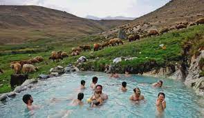 تقع هذه الينابيع علي مسافة 28 كم غرب مدينة اردبيل. والتركيب الكيمياوي لمياه هذه الينابيع الساخنه وان السباحة في هذه العيون يترك انطباعاً مهدئاً لآلام الجهاز العصبي والامراض الروماتيزمية و المفاصل. و هناك العديد من الينابيع في هذه المنطقة و هي، عين ماء (قره سو)، و عين ماء (ساري سو)، و عين (كاوميش كلي) و عين (جنرال) و عين (بل سويي) و عين (جشمه) و كلها عيون ساخنة.