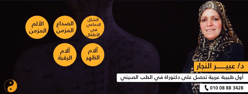 دلوقتي الحل موجود في مصر من غير أي جراحة أو أدوية تعيش عليها عمرك كله و على ايد دكتورة من أفضل و امهر الدكاترة, الدكتورة عبير النجار الحاصلة على الدبلومة والماجستير من الكلية النوردية في الدنمارك ودكتوراة في الطب الصيني جامعة نانجينج بالصين مع خبرة تتعدى ٢٥ سنة في العلاج بالطب الصيني. و مع كامل الحرص على استيراد كافة الأدوات الخاصة من مصدرها الطبيعي و عيادة على اعلى قدر من الجودة و التميز دلوقتي أتعالج في الصين من مصر.