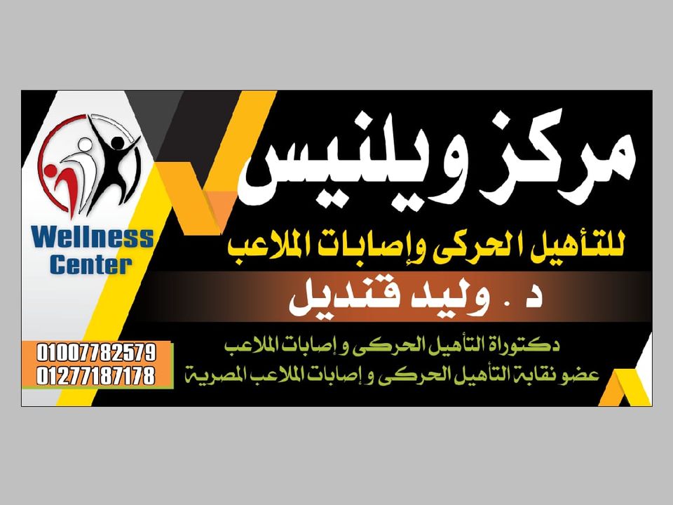 للتأهيل الحركي وإصابات الملاعب- تخسيس- نحافة. مركز ويلنيس Wellness Center د. وليد قنديل دكتوراه قسم علوم الصحه جامعة بنها إستشاري التأهيل الحركي وإصابات الملاعب بنادي الانتاج الحربي عضو نقابة التأهيل الحركي واصابات الملاعب المصريه المركز يؤهل : حالات الشلل النصفي hemiplegia - رباط صليبي cruciate ligament - غضروف ركبه / ظهر meniscus - تأهيل ما بعد الكسور fractures - حالات CP للاطفال cerepral palsy - تأهيل إصابات العمود الفقري والعنق spinal cord - cervicle vertebra - حالات العصب السابع facial nerve - تصلب الكتف frozen shoulder ... تخسبس Lose weight - حالات النحافة Gain Weight