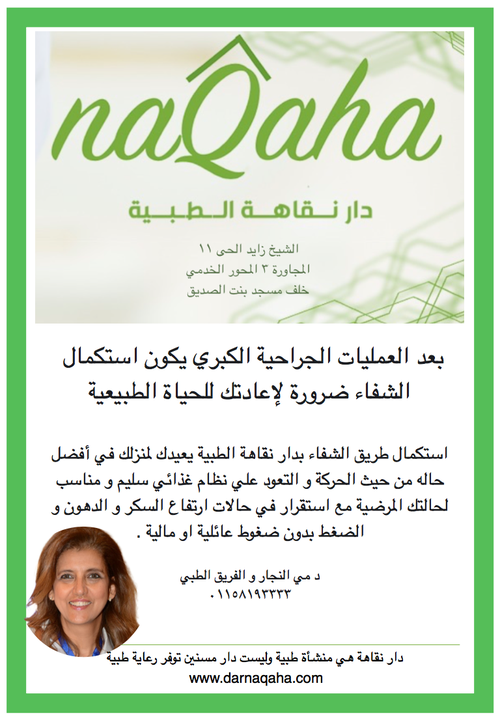 دار نقاهة الطبیة دار نقاهة تقدم خدمات ما بعد الخروج من المستشفى. إنها واحدة من أول المنشآت الطبیة لإعادة التأهیل الطبي للمرضى في القاهرة یتم خروج العدید من المرضى بعد العملیات الجراحیة الكبرى لاستكمال الشفاء في المنزل. خلال :مرحلة التعافي یحتاج المرضى إلى .العنایة الجراحیة المتكررة بالجروح ومراقبتها .مراقبة ضغط الدم وسكر الدم منع تقرحات الفراش نظام غذائي خاص العلاج الطبیعي الیومي ما یمكن للعائلات أن تقدم هذه الرعایة لأحبائهم. هذا لأنهم لا یمتلكون التدریب المطلوب ، فهم نادرا عادة ما یشغلون وظائف غیر مرنة ، وقد یكونون من كبار السن و العنایة بأحبائهم قد تصبح مرهقة جسدیا ، قد یكونوا آباء وأمهات مع أطفال رضع او في سن المدرسة. تلجأ العائلات إلى الرعایة المنزلیة. لكن الرعایة المنزلیة مكلفة وغیر خاضعة للرقابة المهنیة و المالیة. في ضوء هذه المشاكل ، یقدم دار نقاهة الطبیة حلا مثالیا بأسعار معقولة. نحن نقدم رعایة مصممة لكل مریض حسب احتیاجاته .الطبیة